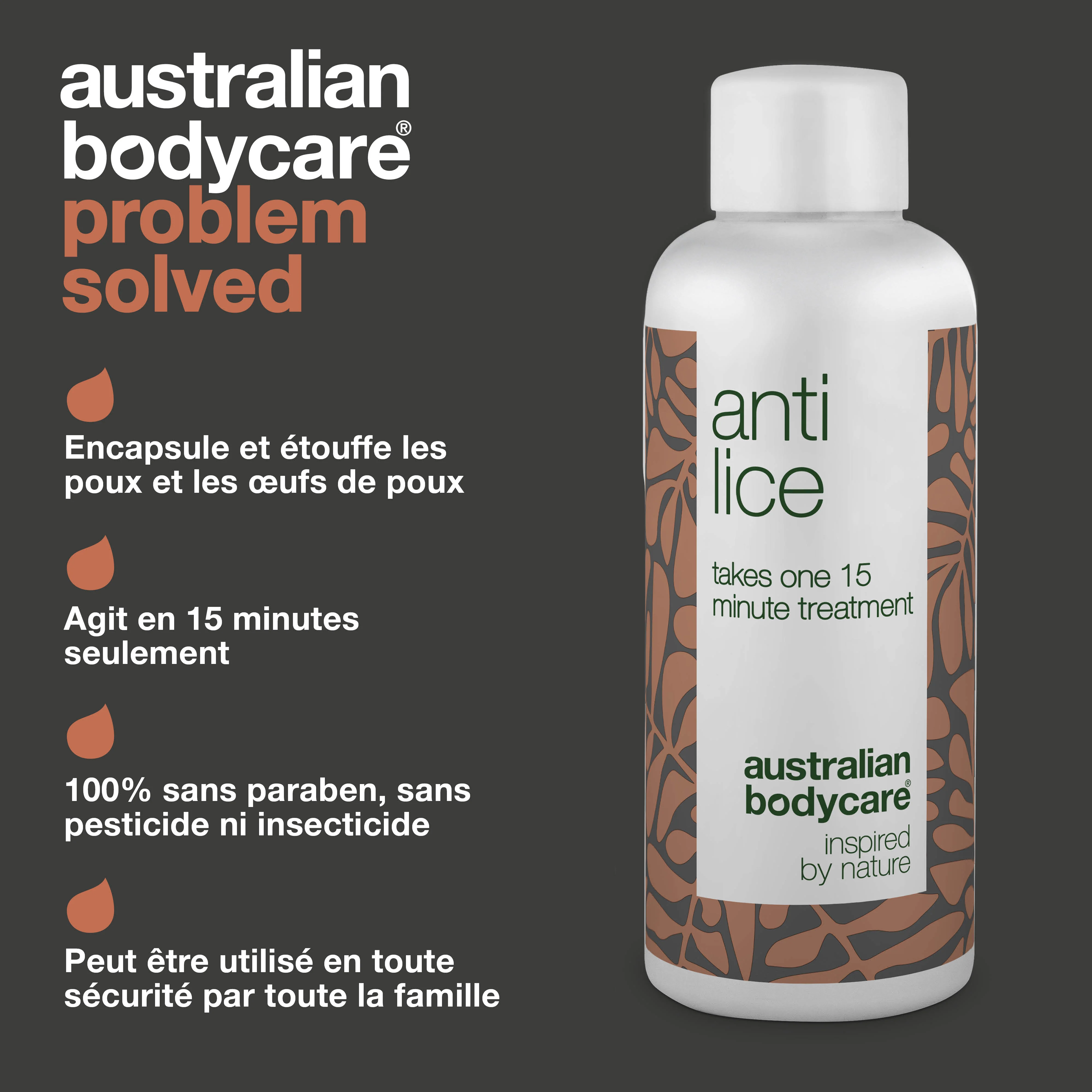 Avez-vous, ou votre famille, des poux ? Anti poux - traitement efficace et non toxique contre les poux à base d'huile naturelle de tea tree - agit en seulement 15 minutes. | L'ingrédient actif Dimethicone encapsule et tue les poux et les œufs. 100% sans parabène ni insecticide | 100% vegan.