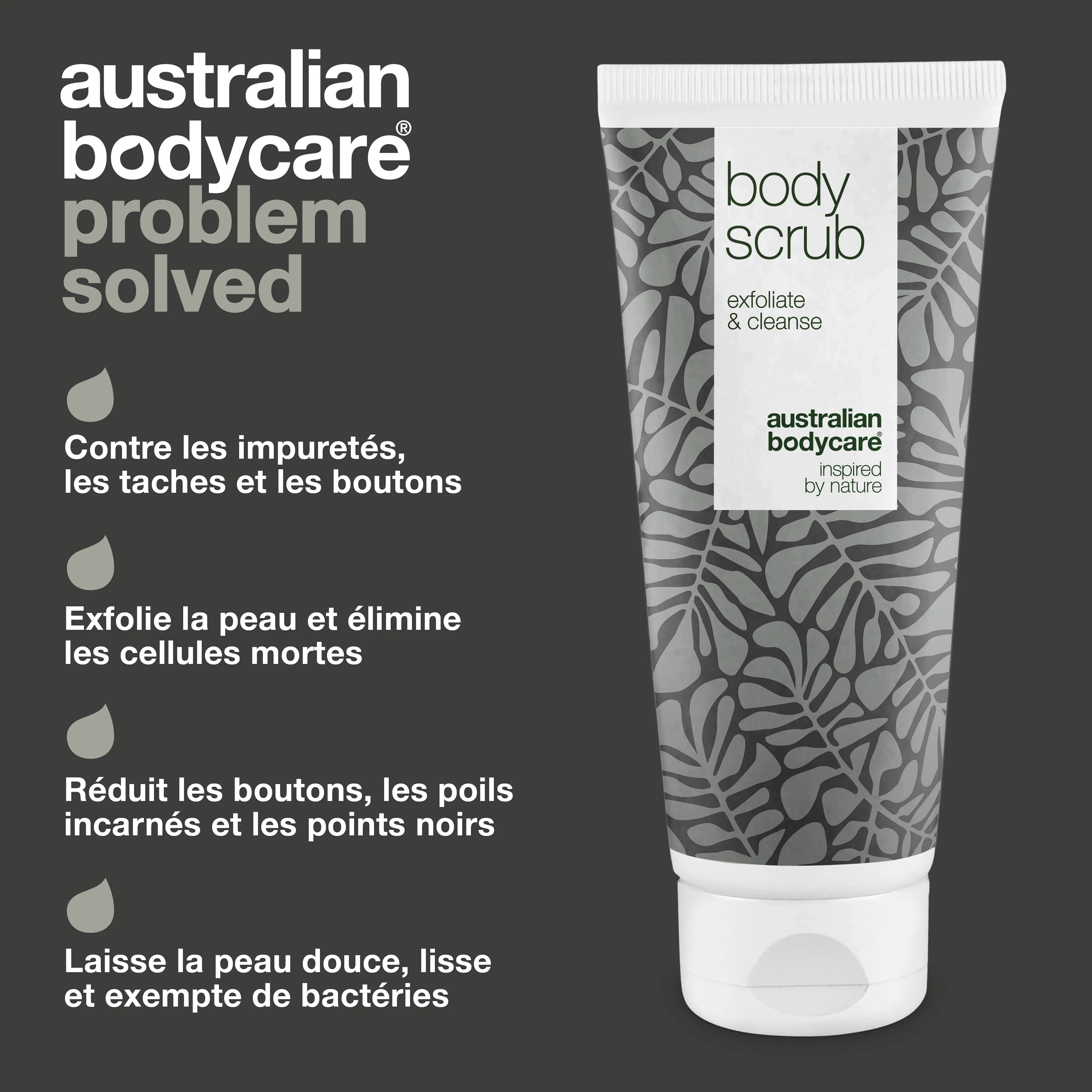 Vous voulez vous débarrasser des boutons et des imperfections du corps ? Gommage exfoliant pour tout le corps, peut également être utilisé comme gommage intime | Bon contre les boutons et les imperfections sur le corps | L'huile de tea tree combat les bactéries, tandis que l'actif naturel allantoïne adoucit et hydrate | Pour tous les types de peau.