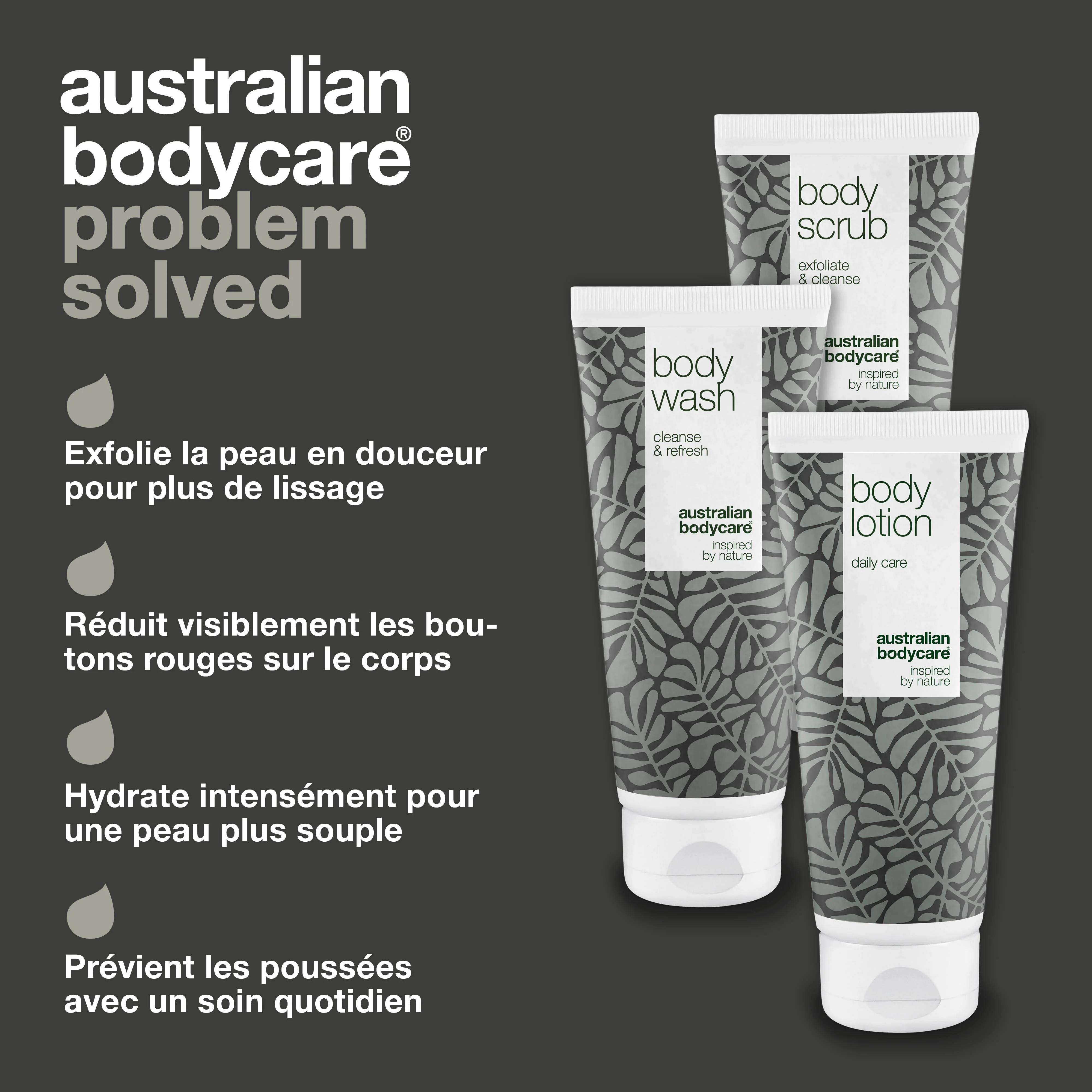 Vous avez de petites bosses rouges sur les cuisses, les bras ou le dos ? Le kit pour le traitement de la kĂ©ratose pilaire prend soin des taches rouges sur la peau et la maintient en bonne santĂ© | Les 3 produits nettoient en profondeur, hydratent et aide au traitement la kĂ©ratose pilaire | Peut ĂȘtre utilisĂ© pour le nettoyage quotidien et le soin des petits points rouges sur la peau | Ă base d'huile de tea tree 100% naturelle.