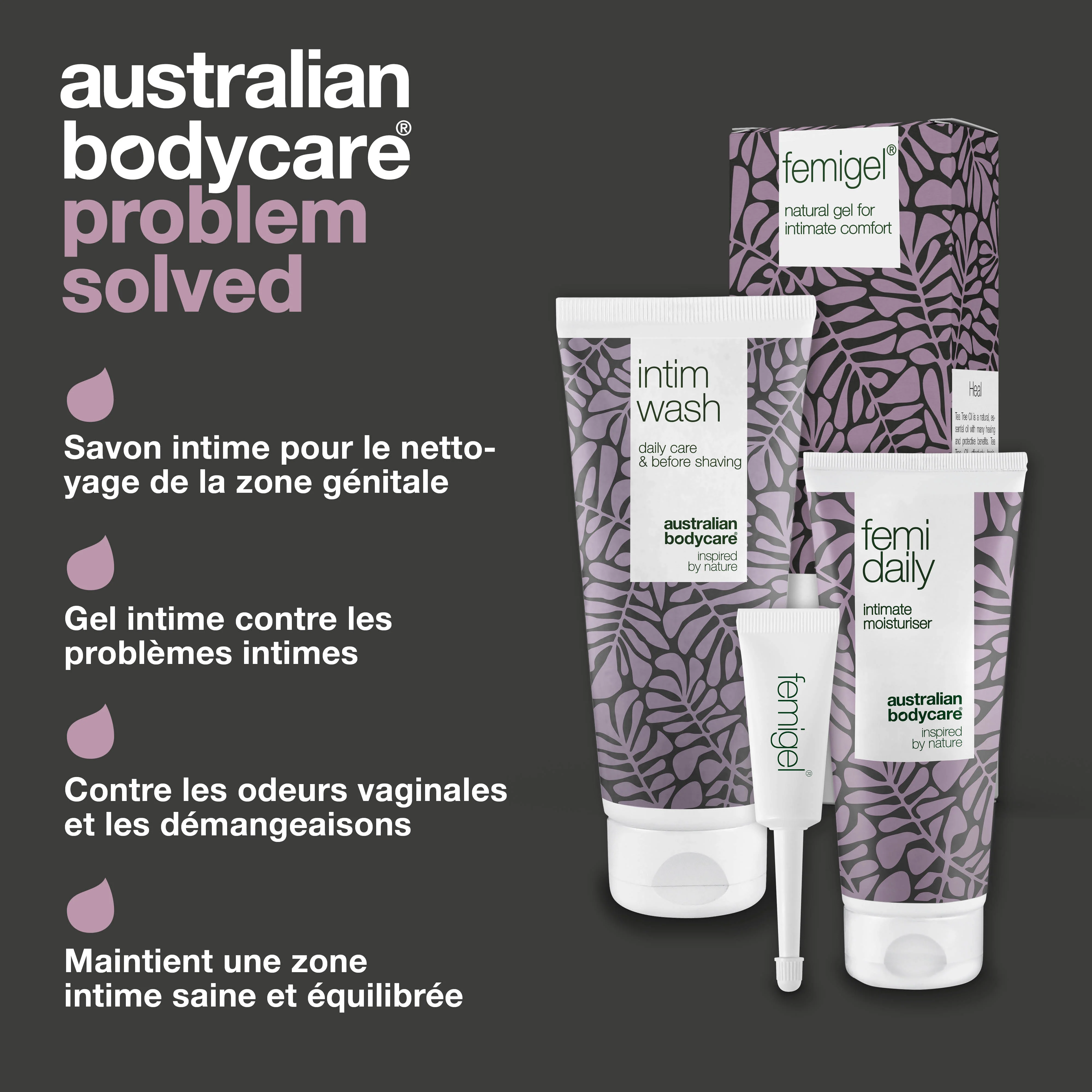 Le kit contient Intimate Wash 200 ml, Femigel 5x7 ml et Femi Daily 100 ml.