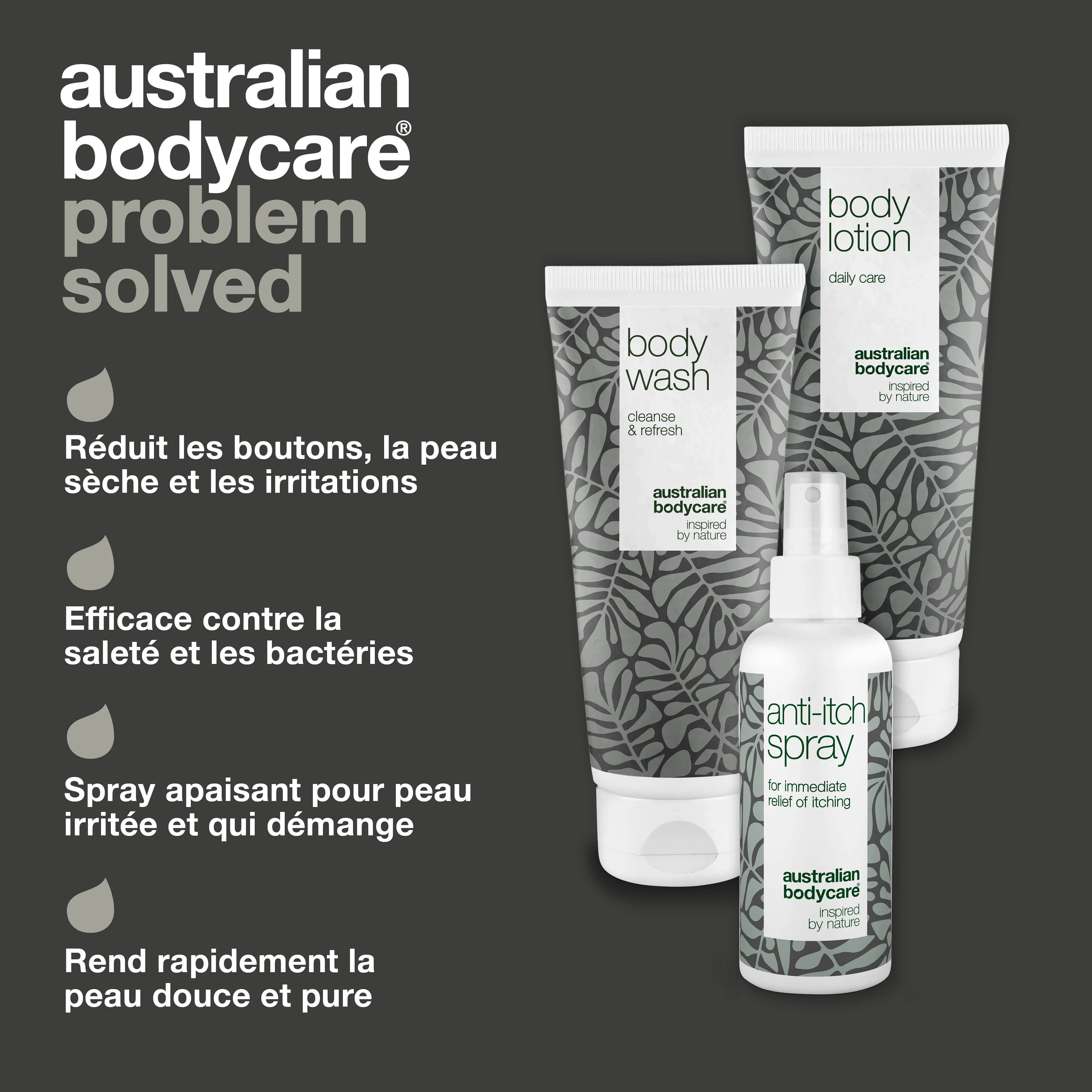 Le kit contient un Body Wash (200 ml), Body Lotion (200 ml) et Anti-Itch Spray (100 ml).